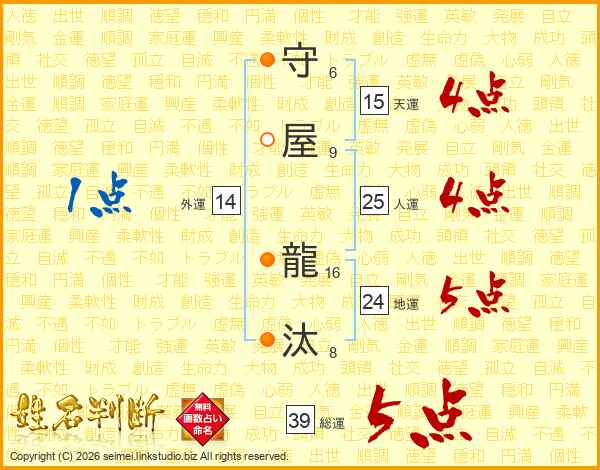 守(6画)屋(9画) 龍(16画)汰(8画)