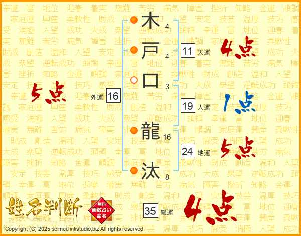 木(4画)戸(4画)口(3画) 龍(16画)汰(8画)
