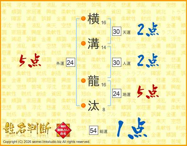 横(16画)溝(14画) 龍(16画)汰(8画)