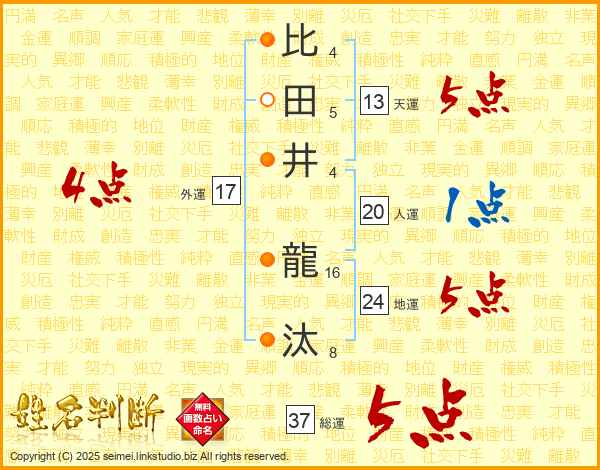 比(4画)田(5画)井(4画) 龍(16画)汰(8画)