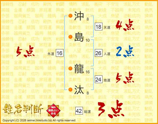 沖(8画)島(10画) 龍(16画)汰(8画)