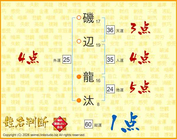 磯(17画)辺(19画) 龍(16画)汰(8画)