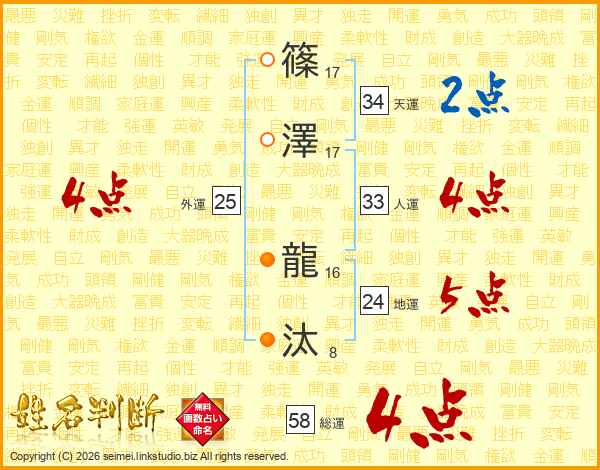 篠(17画)澤(17画) 龍(16画)汰(8画)