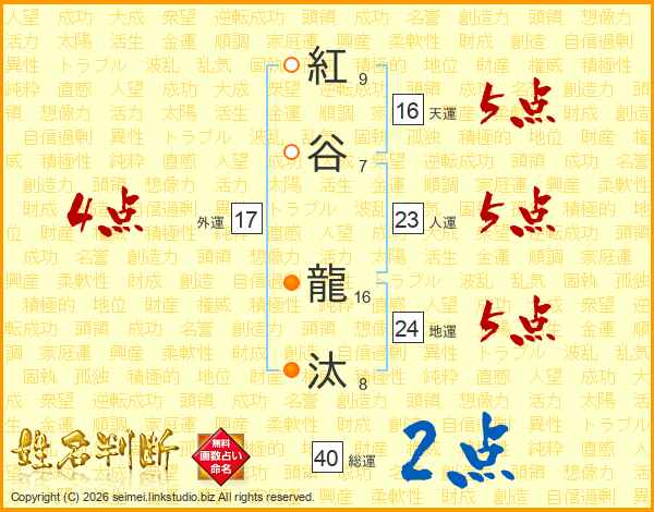 紅(9画)谷(7画) 龍(16画)汰(8画)