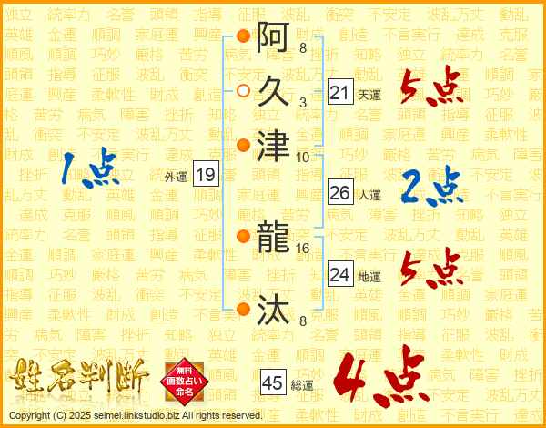 阿(8画)久(3画)津(10画) 龍(16画)汰(8画)