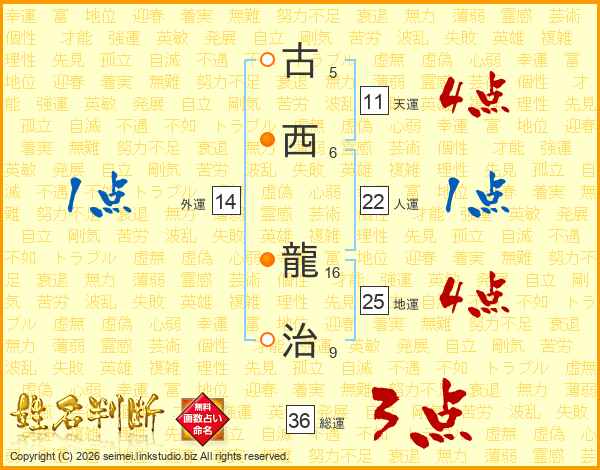 画数の奇数(○陽)と偶数(●陰)の配列で吉凶を占います。どちらかにかたよる名前は大凶名で避ける必要があります。画数の奇数偶数。