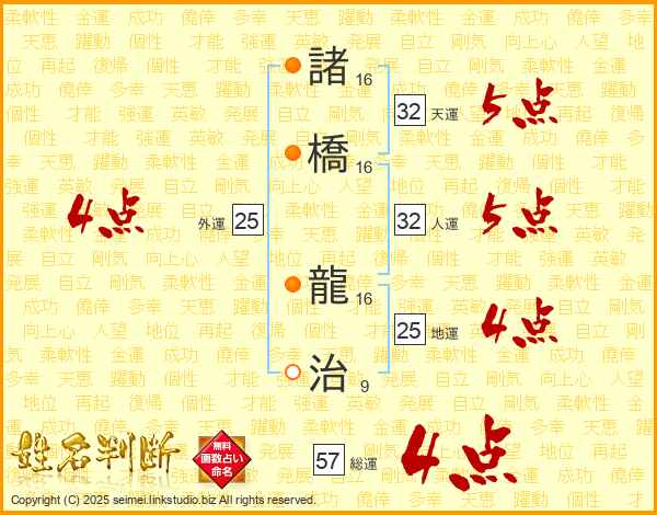 諸(16画)橋(16画) 龍(16画)治(9画)