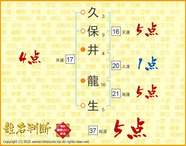 久(3画)保(9画)井(4画) 龍(16画)生(5画)