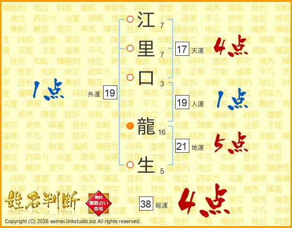 江(7画)里(7画)口(3画) 龍(16画)生(5画)