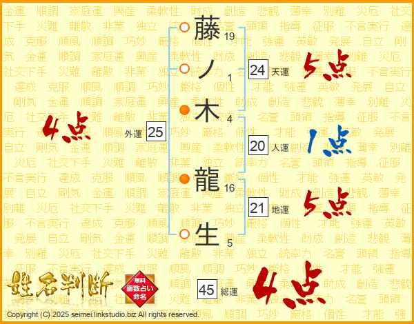 藤(19画)ノ(1画)木(4画) 龍(16画)生(5画)