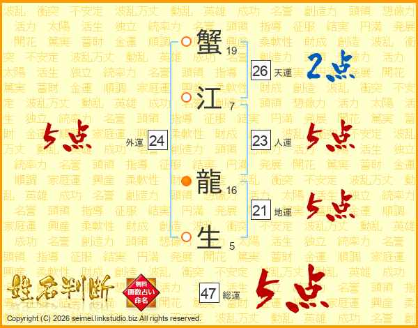 蟹江龍生さんの総運は47画の5点!