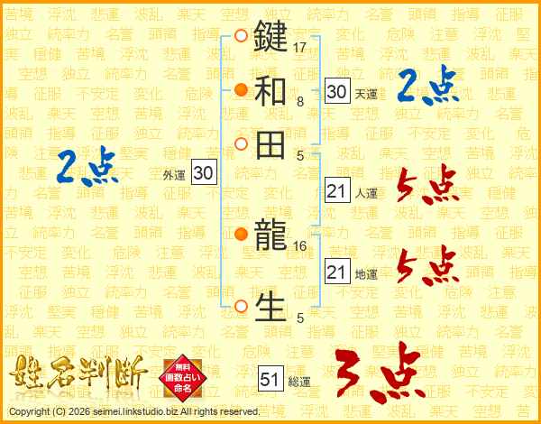 鍵和田龍生さんの地運は21画の5点!