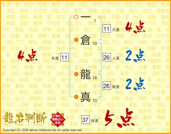 あなたの人生を表す1番重要な運勢です。生涯を通じて影響する総合運となり、主に50歳以降の晩年期に影響を及ぼします。苗字と名前の合計画数。