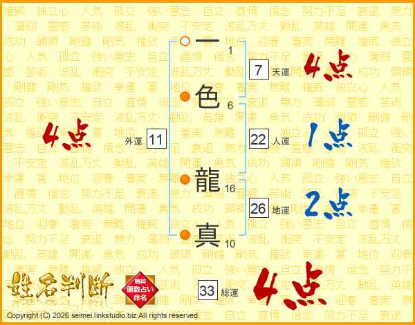 あなたの人生を表す1番重要な運勢です。生涯を通じて影響する総合運となり、主に50歳以降の晩年期に影響を及ぼします。苗字と名前の合計画数。