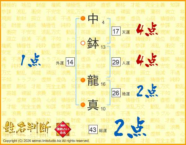 あなたの人生を表す1番重要な運勢です。生涯を通じて影響する総合運となり、主に50歳以降の晩年期に影響を及ぼします。苗字と名前の合計画数。