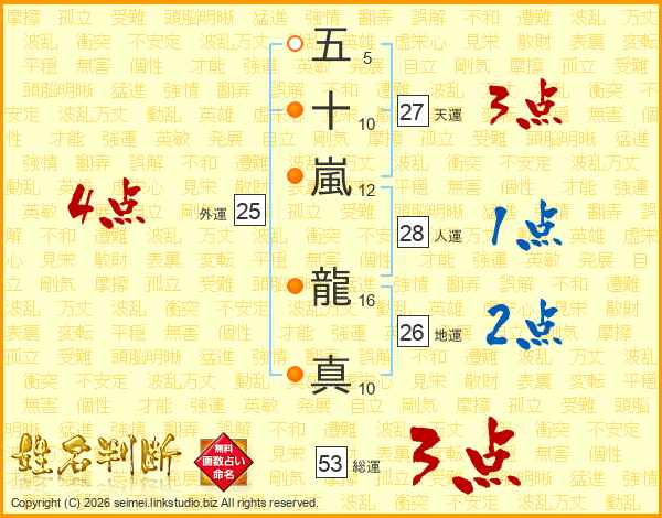 五(5画)十(10画)嵐(12画) 龍(16画)真(10画)