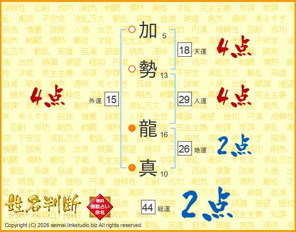 加勢龍真さんの総運は44画の2点!