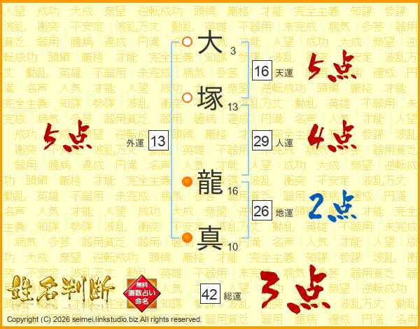 あなたの人生を表す1番重要な運勢です。生涯を通じて影響する総合運となり、主に50歳以降の晩年期に影響を及ぼします。苗字と名前の合計画数。