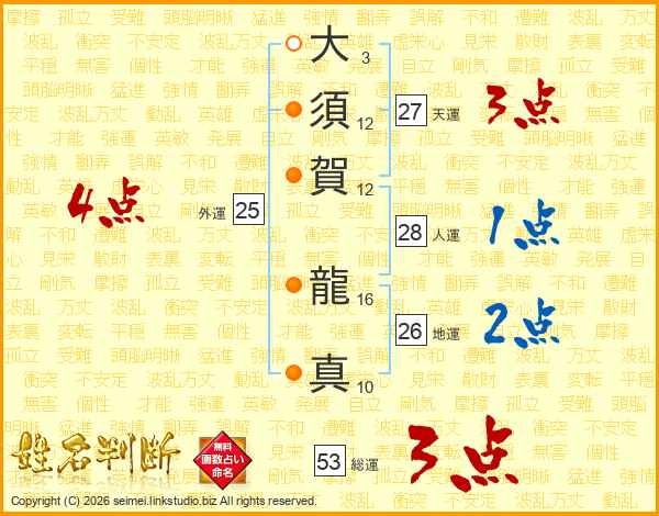 大(3画)須(12画)賀(12画) 龍(16画)真(10画)