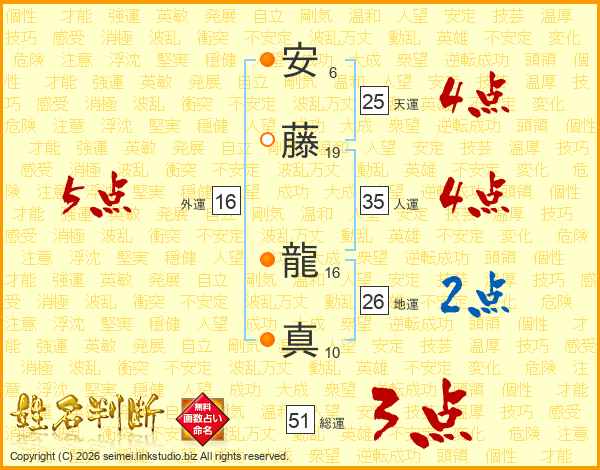 あなたの人生を表す1番重要な運勢です。生涯を通じて影響する総合運となり、主に50歳以降の晩年期に影響を及ぼします。苗字と名前の合計画数。