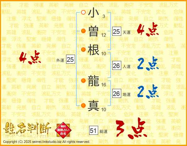 小(3画)曽(12画)根(10画) 龍(16画)真(10画)