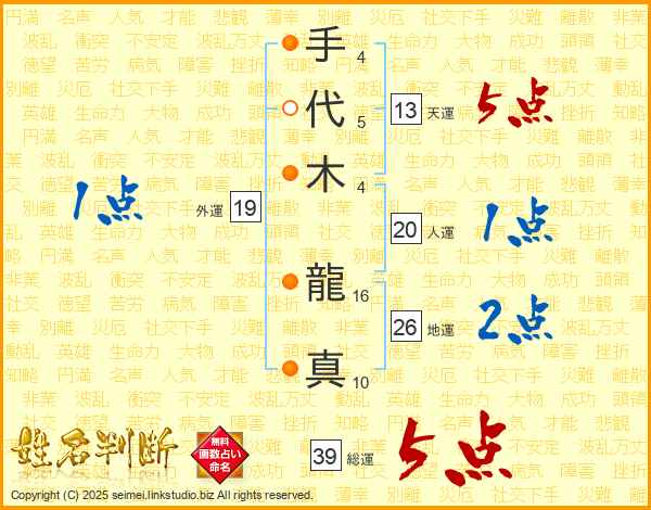 手(4画)代(5画)木(4画) 龍(16画)真(10画)