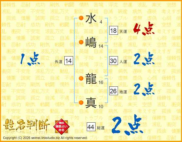 水(4画)嶋(14画) 龍(16画)真(10画)