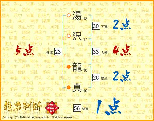 湯(13画)沢(17画) 龍(16画)真(10画)