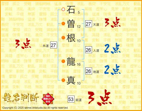 石(5画)曽(12画)根(10画) 龍(16画)真(10画)