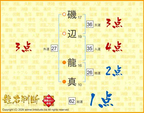 磯(17画)辺(19画) 龍(16画)真(10画)