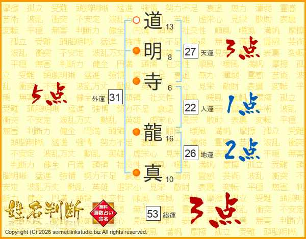 道明寺龍真さんの総運は53画の3点!