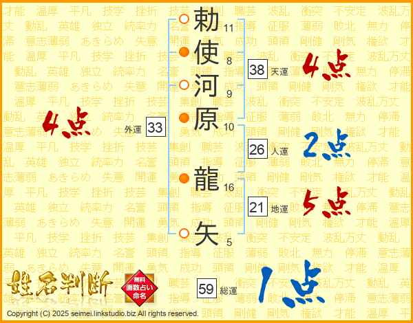 勅(11画)使(8画)河(9画)原(10画) 龍(16画)矢(5画)