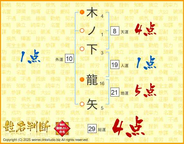 木ノ下龍矢さんの総運は29画の4点!