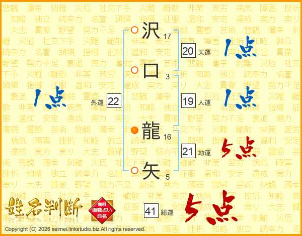 沢口龍矢さんの地運は21画の5点!