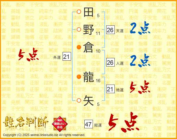 田(5画)野(11画)倉(10画) 龍(16画)矢(5画)