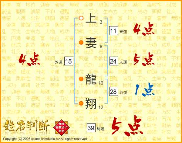 上(3画)妻(8画) 龍(16画)翔(12画)