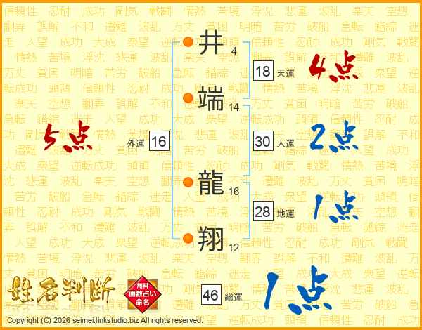 井(4画)端(14画) 龍(16画)翔(12画)