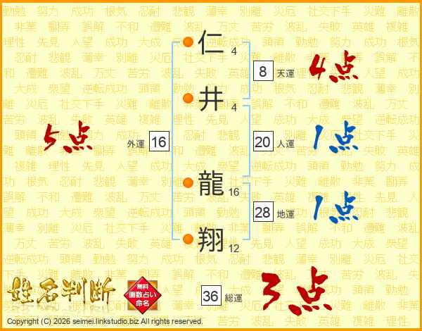 仁(4画)井(4画) 龍(16画)翔(12画)