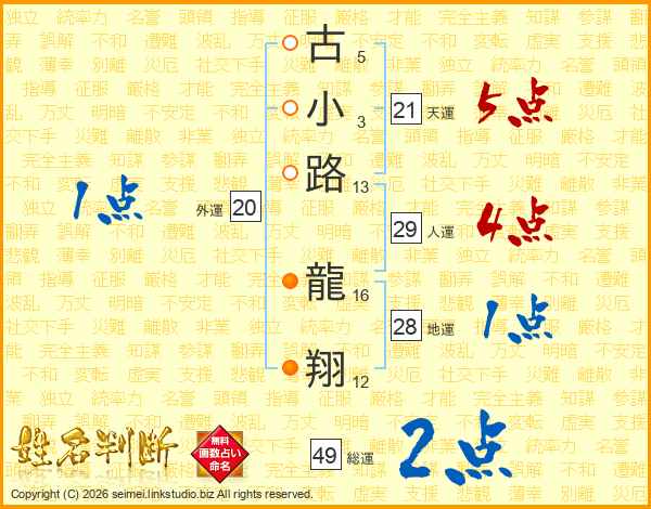 古(5画)小(3画)路(13画) 龍(16画)翔(12画)
