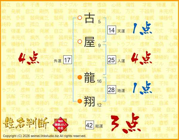 古(5画)屋(9画) 龍(16画)翔(12画)