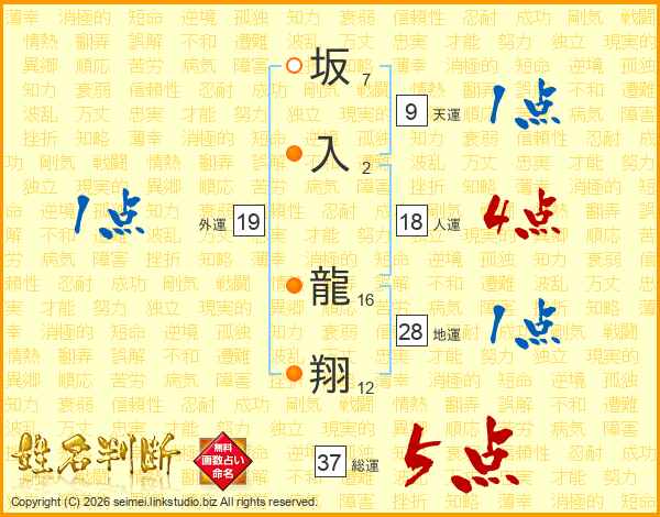 坂入龍翔さんの総運は37画の5点!