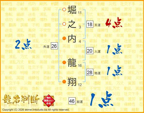 堀(11画)之(3画)内(4画) 龍(16画)翔(12画)