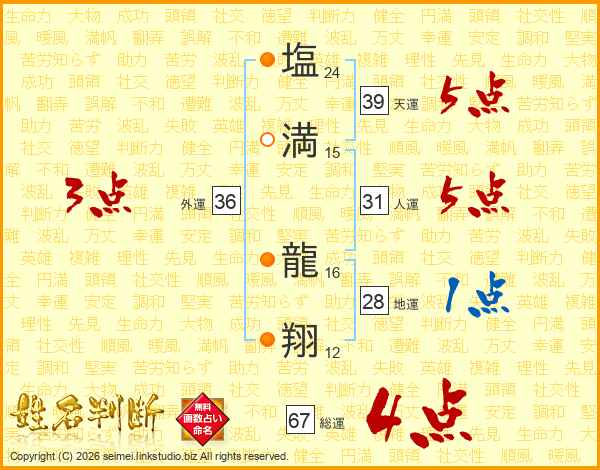 塩(24画)満(15画) 龍(16画)翔(12画)