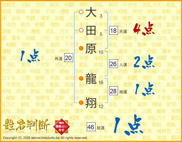 大(3画)田(5画)原(10画) 龍(16画)翔(12画)
