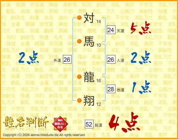 対(14画)馬(10画) 龍(16画)翔(12画)