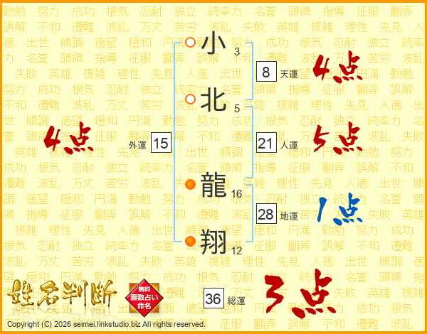 小(3画)北(5画) 龍(16画)翔(12画)