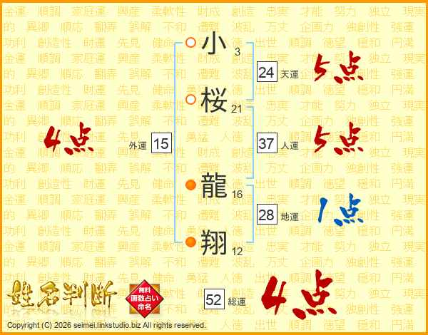 小(3画)桜(21画) 龍(16画)翔(12画)