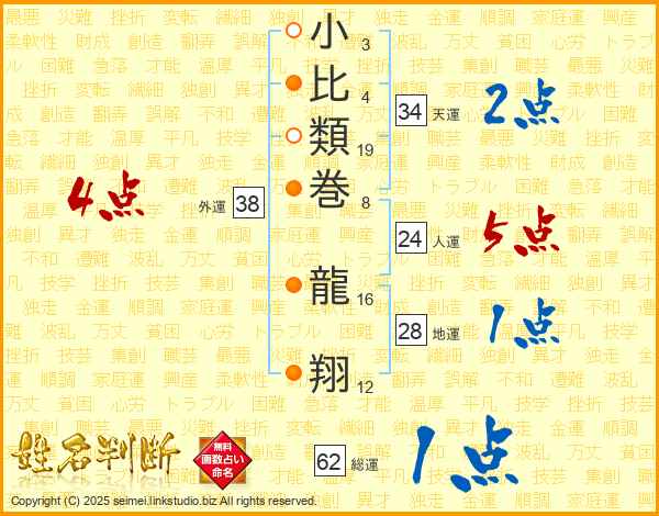 小(3画)比(4画)類(19画)巻(8画) 龍(16画)翔(12画)