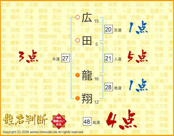 広田龍翔さんの総運は48画の4点!