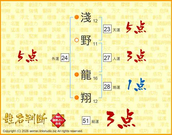 淺(12画)野(11画) 龍(16画)翔(12画)